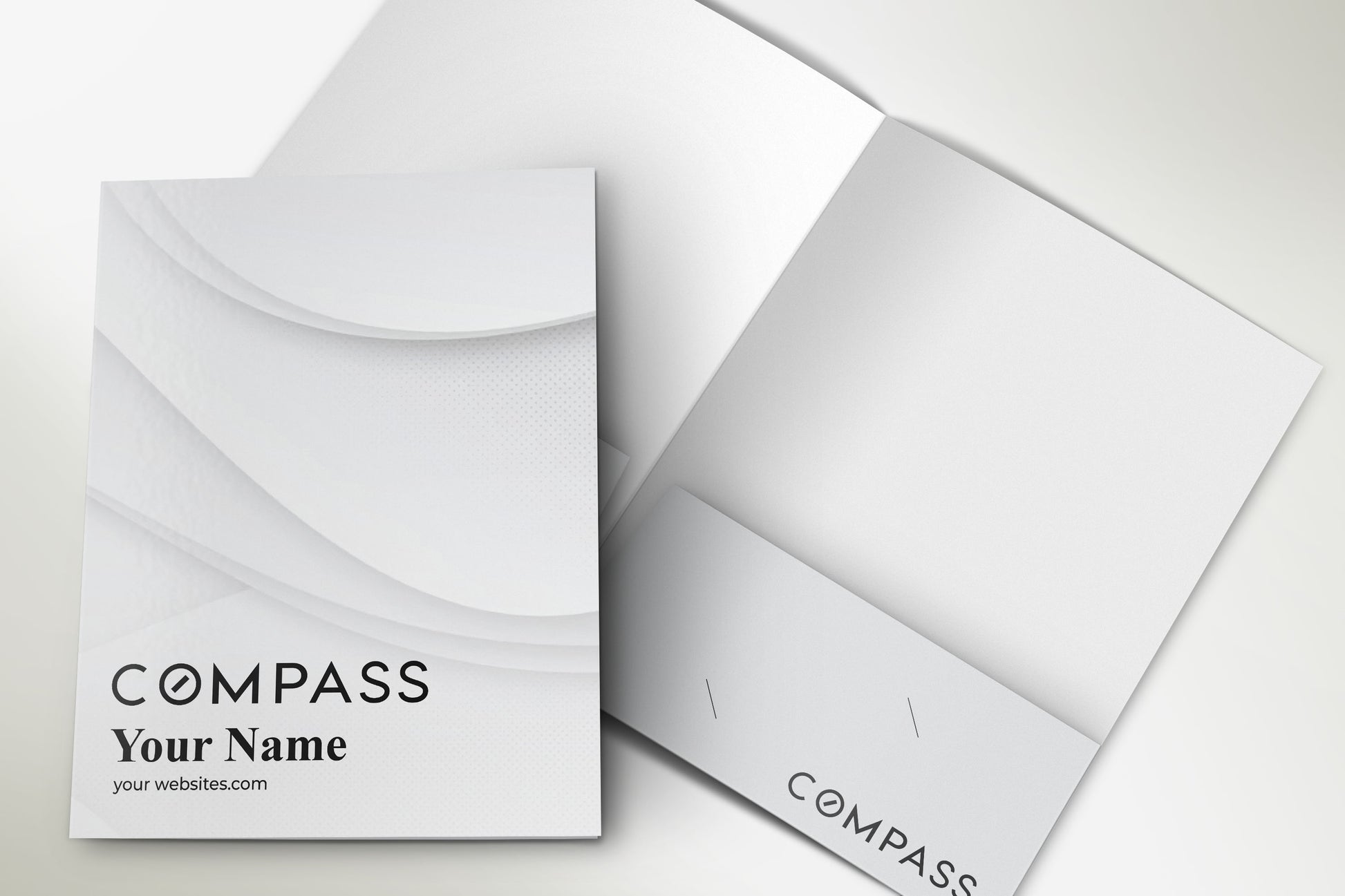 Make sure your client handouts are memorable and easy to find with Presentation Folders and Document Holders from lauprint.com. Our Compass -branded folders have bold designs and colors that will help you stand out from the crowd. Every design includes an interior business card cutout so your information will always be close at hand. Choose from an assortment of presentation, broker, or home owner’s document folder designs that will suit every client and need.