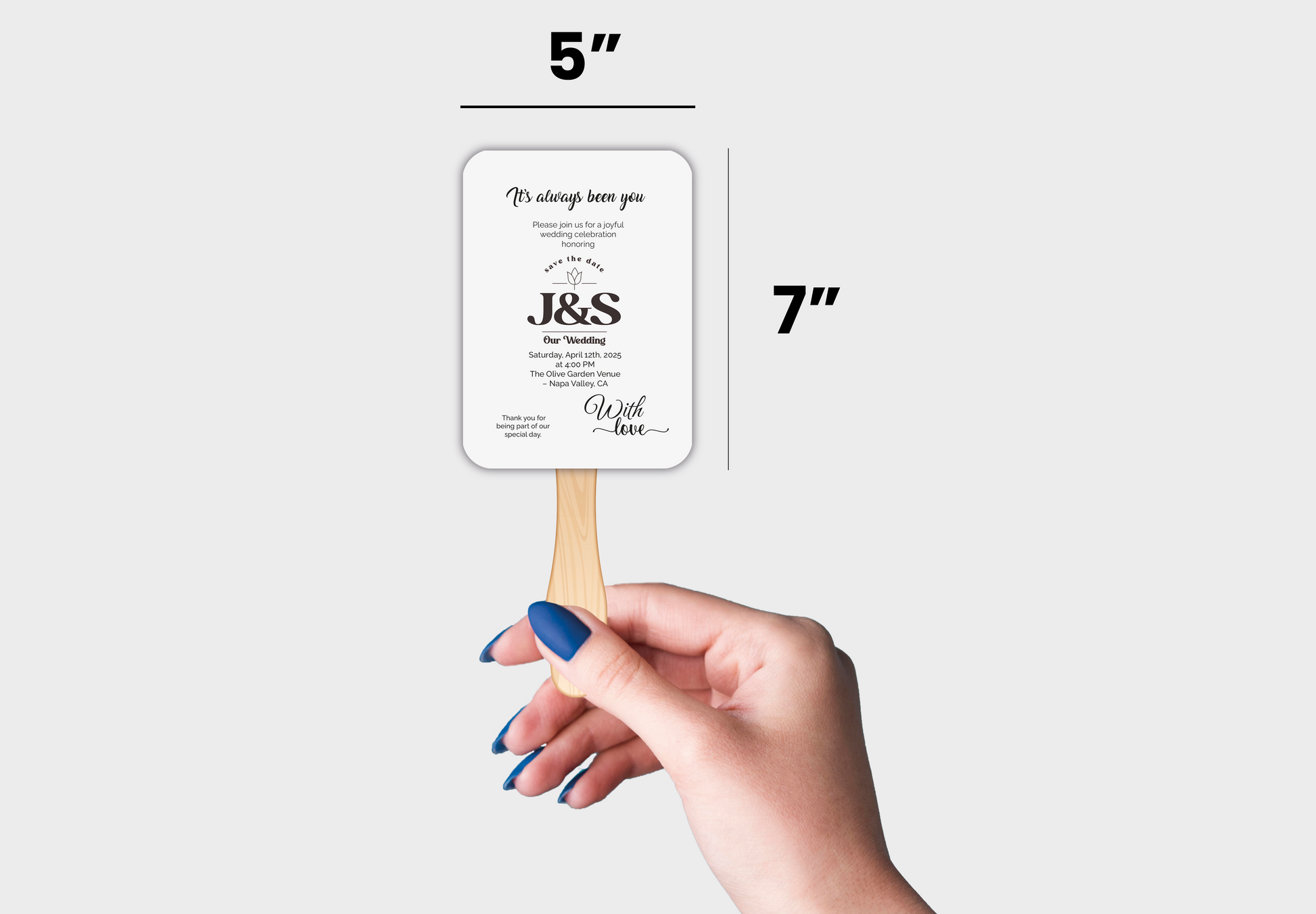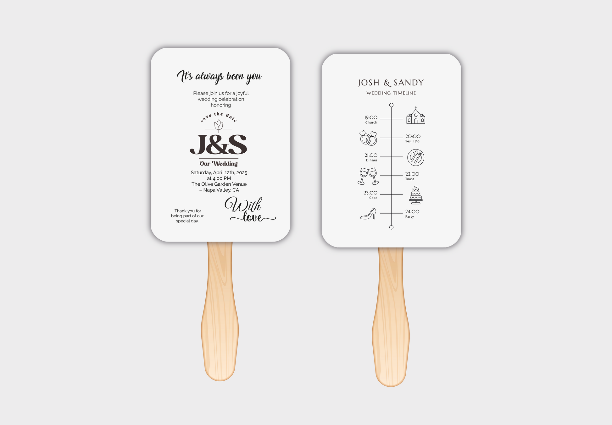 Each fan includes a personalized tag with your names, date, and a short message — or your custom design. Whether you want romantic, minimalist, rustic, or beachy vibes, we’ll create a fan that fits your theme.