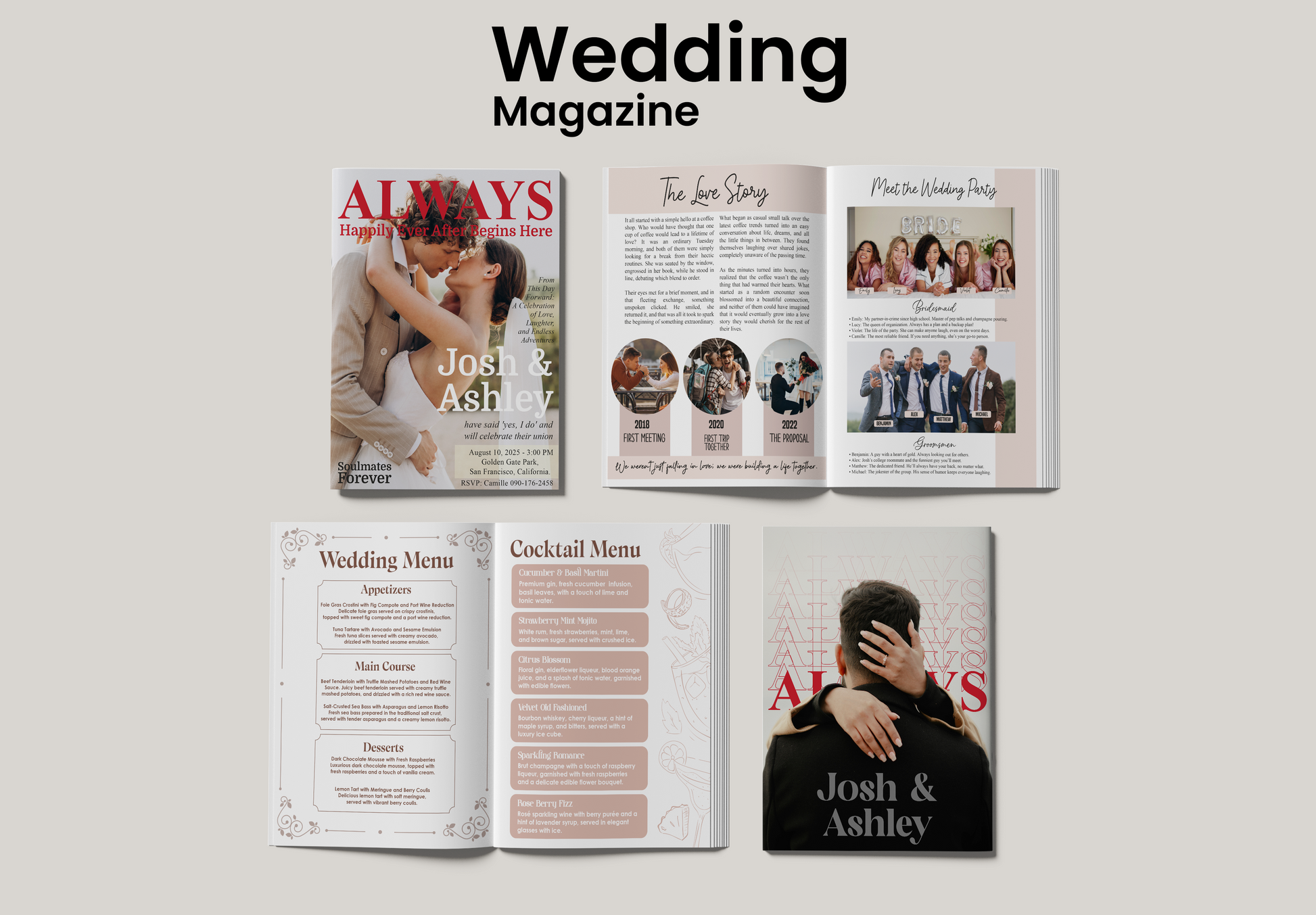 Fully customizable, you can tailor every detail, from photos and colors to the layout and text, ensuring it reflects your unique love story. Whether as a keepsake for yourselves or a thoughtful gift for your guests, this wedding magazine is a stunning way to commemorate your celebration.