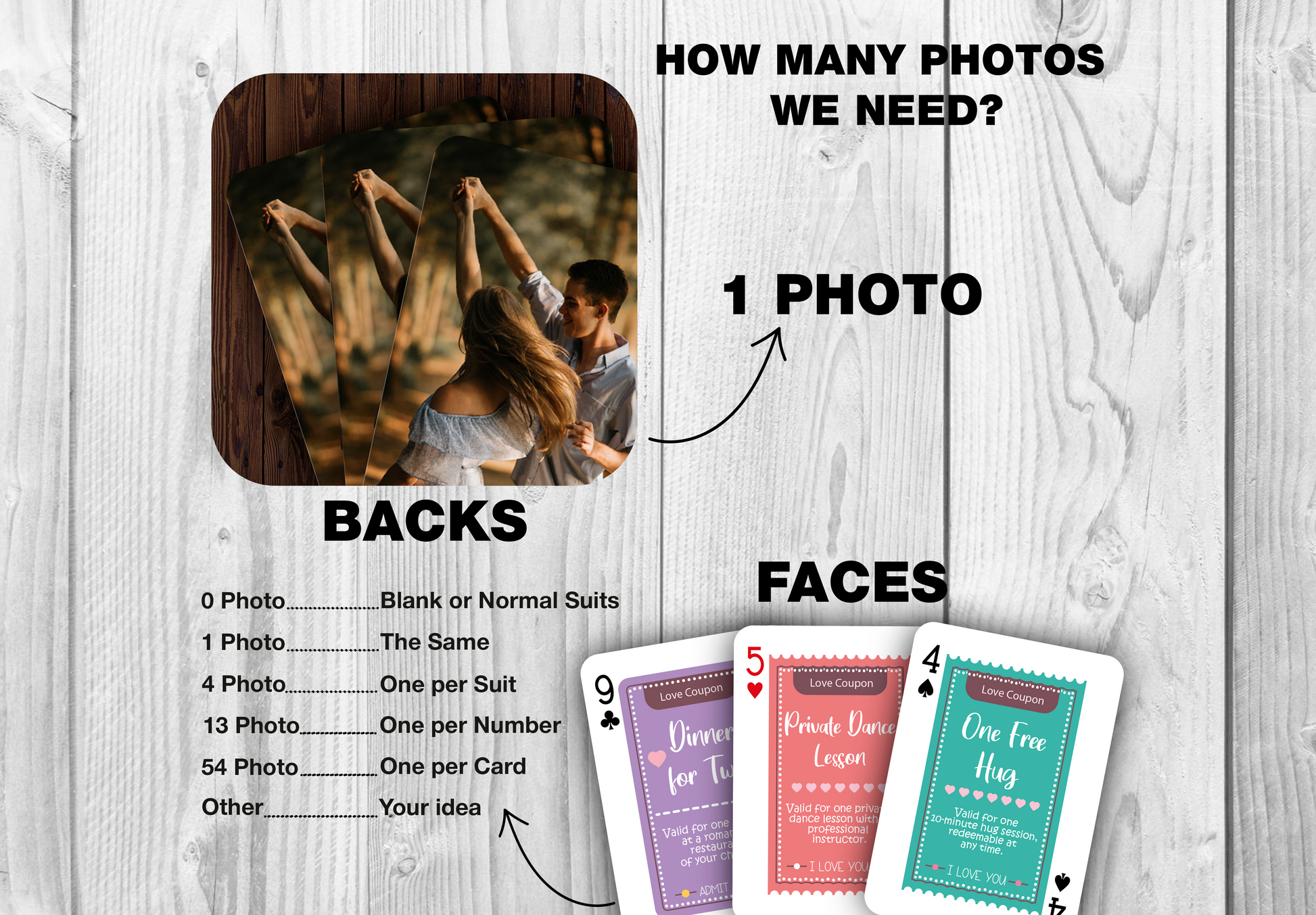 Elevate your date nights with our beautifully designed playing cards featuring customizable love coupons. Enjoy memorable experiences like a spa day, dinner for two, and more!
