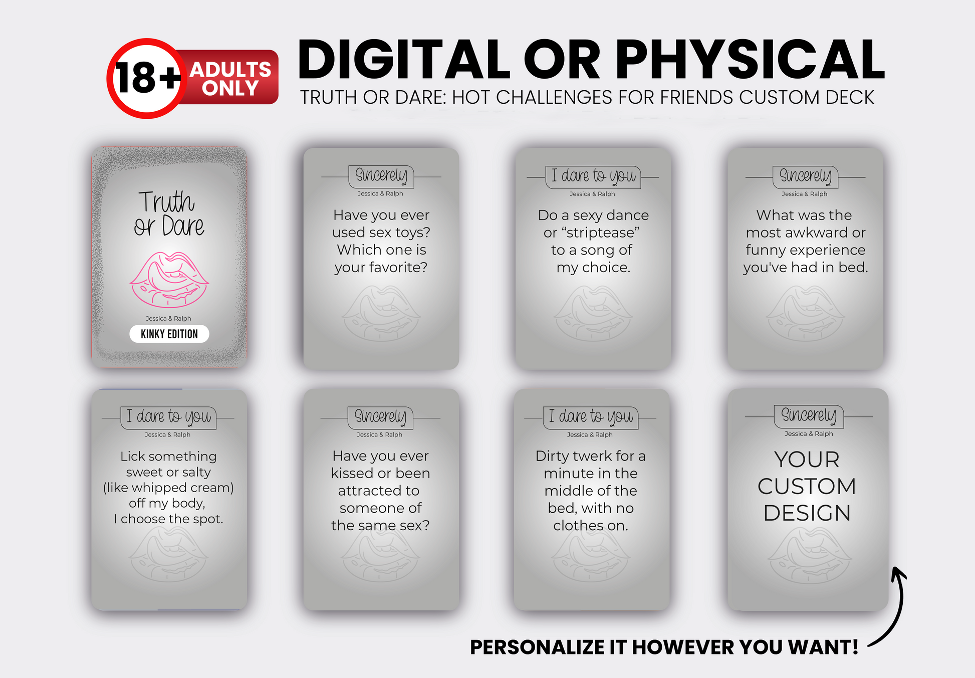 Take your date nights to the next level with this steamy and exciting Truth or Dare card game for couples! Whether you're looking to deepen your connection, add some laughter, or turn up the heat, these 54 daring cards will keep things fun, flirty, and full of surprises.