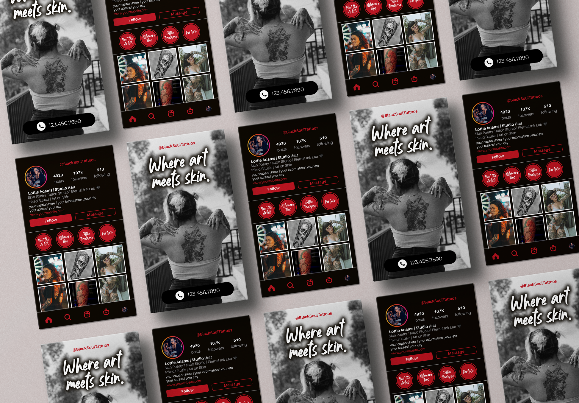 Designed for tattoo artists and studios, these cards showcase your Instagram handle, logo, and contact info in a bold, professional layout. Use them as thank you inserts, portfolio samplers, or appointment cards.