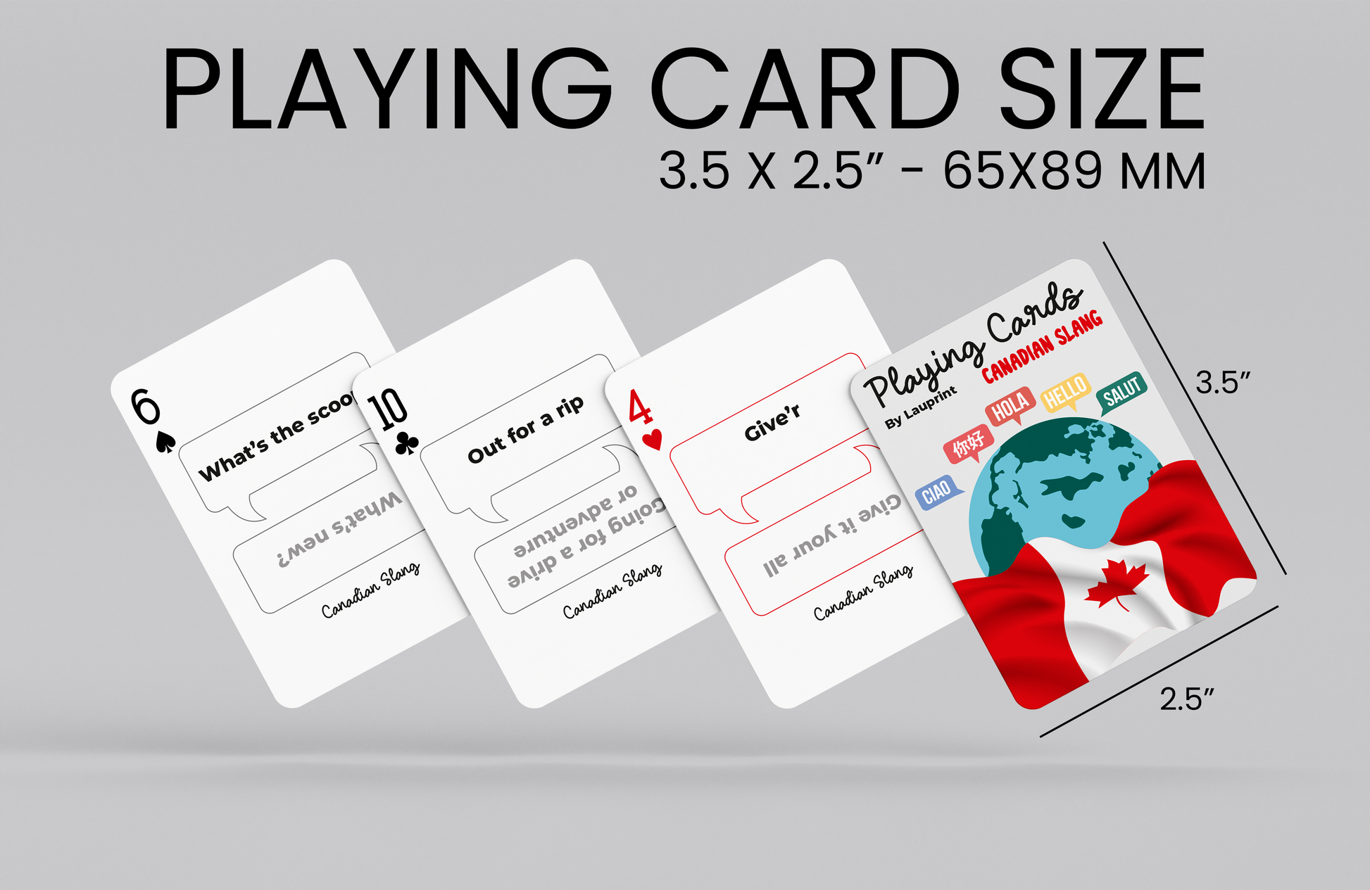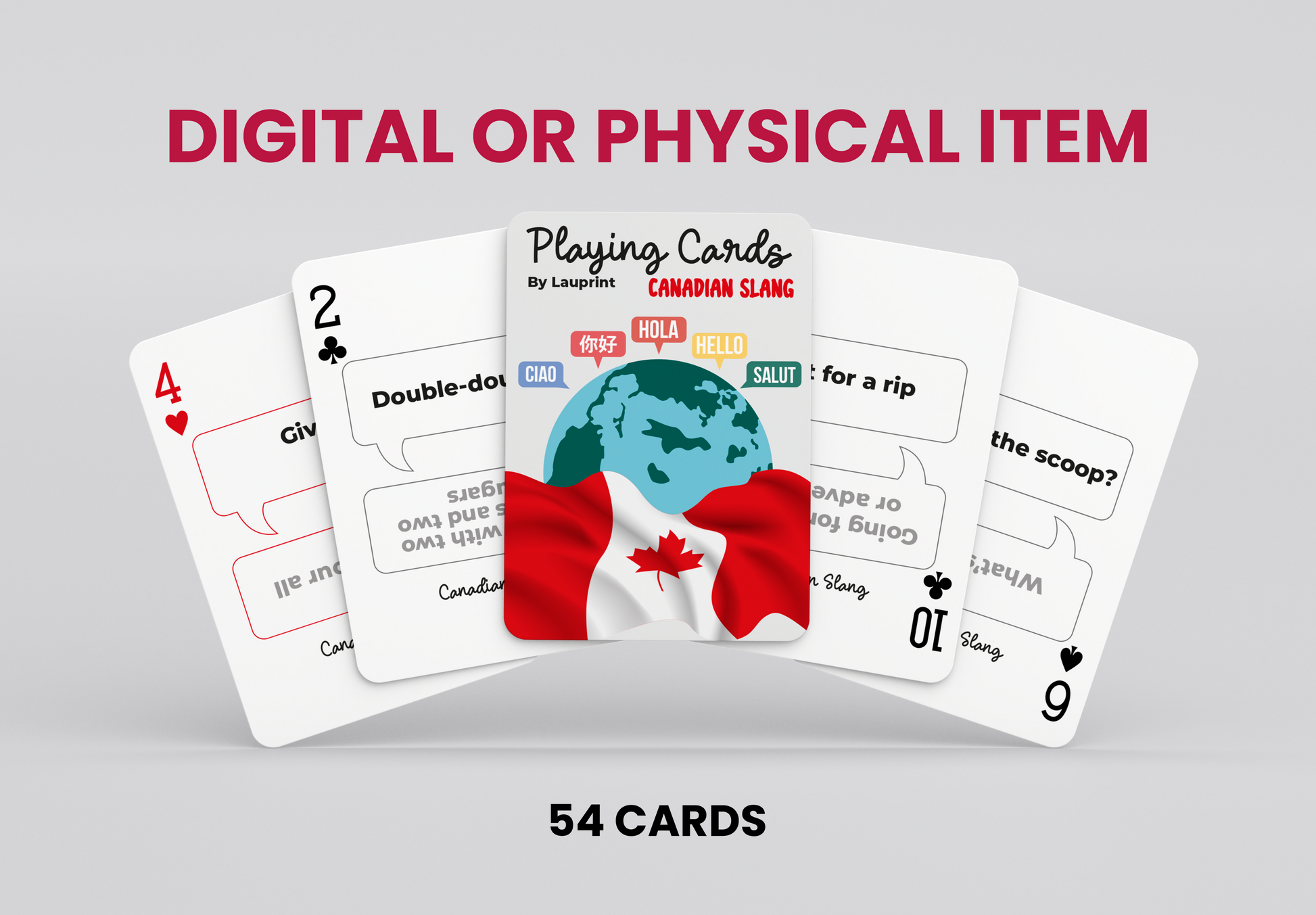 Explore the unique charm of Canadian English with this fun slang-themed playing card deck. Each card showcases popular expressions and phrases from across Canada, making it a great souvenir or gift. Perfect for travelers, language enthusiasts, or anyone looking to sound like a true Canadian!